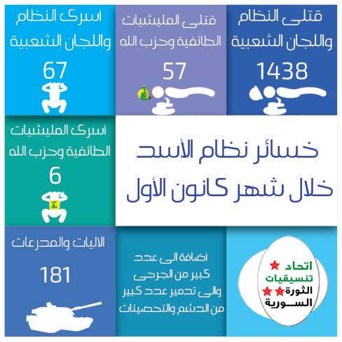أحصى اتحاد تنسيقيات الثورة خسائر نظام الأسد خلال شهر كانون الأول الماضي , حيث بلغ عدد قتلى النظام واللجان الشعبية 1438 قتيل , في حين قتل 57 عنصراً من المليشيات الطائفية التابعة له , كما تمكن الثوار في الشهر الماضي من أسر سبعة وستين عنصراً لقوات النظام وستة عناصر لمليشيا حزب الله اللبناني .