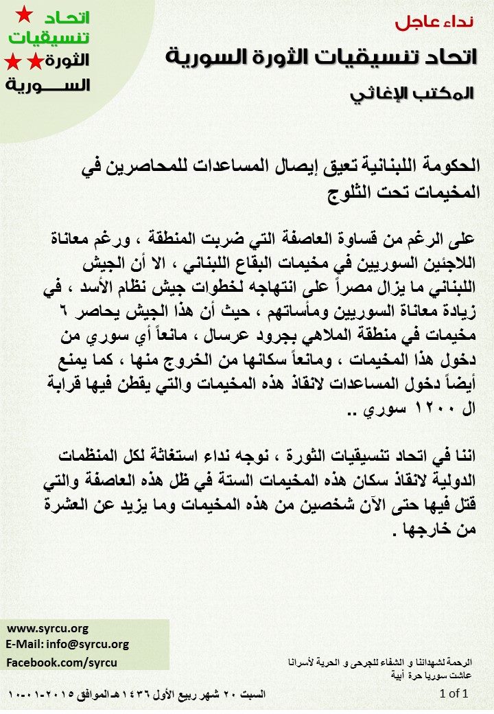 اننا في اتحاد تنسيقيات الثورة , نوجه نداء استغاثة لكل المنظمات الدولية لانقاذ سكان هذه المخيمات الستة في ظل هذه العاصفة والتي قتل فيها حتى الآن شخصين من هذه المخيمات وما يزيد عن العشرة من خارجها .