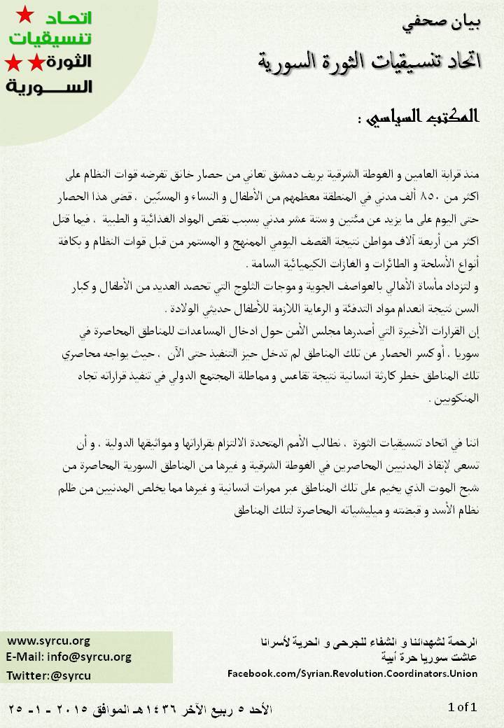اننا في اتحاد تنسيقيات الثورة , نطالب الأمم المتحدة الالتزام بقراراتها و مواثيقها الدولية, و أن تسعى لإنقاذ المدنيين المحاصرين في الغوطة الشرقية و غيرها من المناطق السورية المحاصرة من شبح الموت الذي يخيم على تلك المناطق عبر ممرات انسانية و غيرها مما يخلص المدنيين من ظلم نظام الأسد و قبضته و ميليشياته المحاصرة لتلك المناطق .