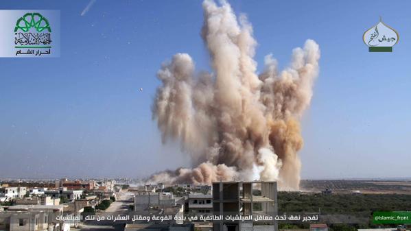 تمكن جيش الفتح صباح اليوم من تفجير نفق كانت تتحصن فيه مليشيات النظام الطائفي في الفوعة وكفريا , مما أسفر عن مقتل 20 عنصراً واصابة عشرات آخرين من عناصر النظام , كما قام بتفجير نفق آخر في نفس المنطقة عبر تفخيخه بخمسة عشر طناً من البارود .