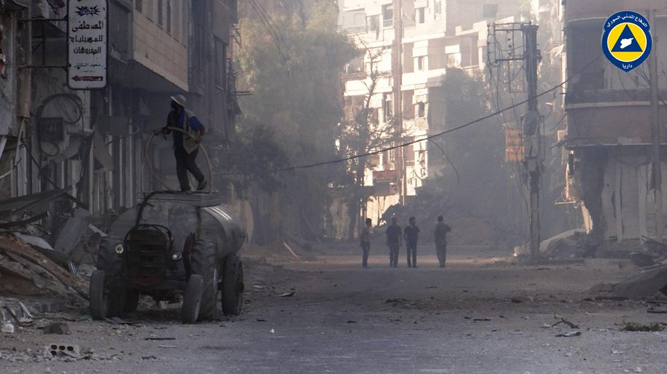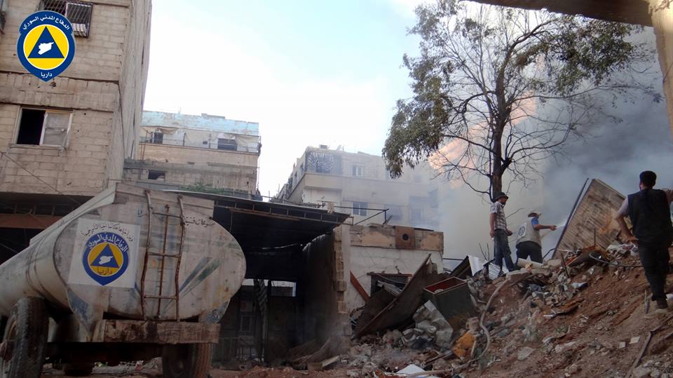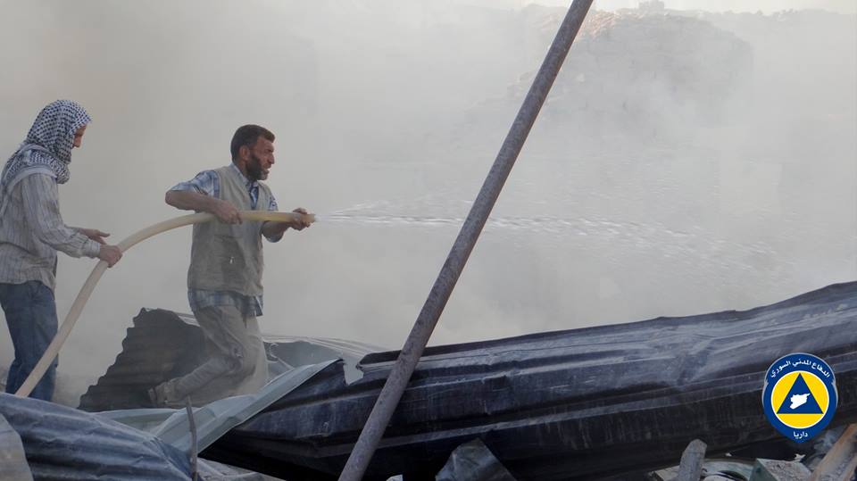 وكانت قوات النظام قد قصفت يوم الثلاثاء الماضي مدينة داريا باسطوانات متفجرة تحوي النابالم الحارق , واستمرت الحرائق الناجمة عنه لأكثر من 24 ساعة .
