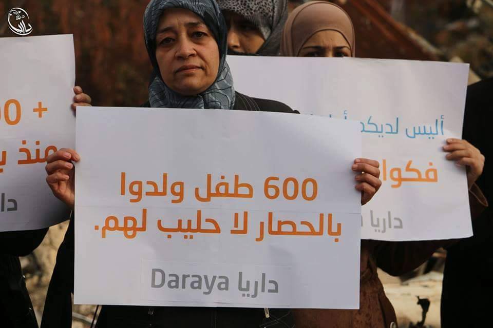 والجدير بالذكر أن ما يقارب " ٦٠٠ " طفل ولدوا داخل مدينة داريا أصبحت حياتهم مهددة نتيجة نقص مادة الحليب بالإضافة للحاضنات و المواد الطبية اللازمة.