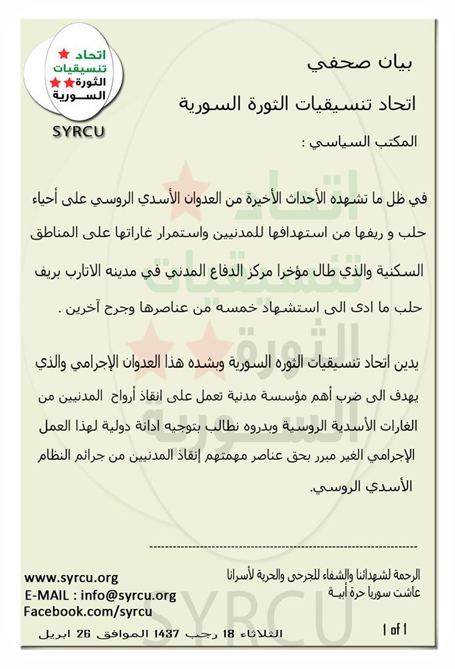 يدين اتحاد تنسيقيات الثوره السورية وبشده هذا العدوان الإجرامي والذي يهدف الى ضرب أهم مؤسسة مدنية تعمل على انقاذ أرواح المدنيين من الغارات الأسدية الروسية وبدروه نطالب بتوجيه ادانة دولية لهذا العمل الإجرامي الغير مبرر بحق عناصر مهمتهم إنقاذ المدنيين من جرائم النظام الأسدي الروسي.
