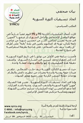 بيان اتحاد تنسيقيات الثورة يدين الأعمال التي تتركبها الميلشيات الكردية