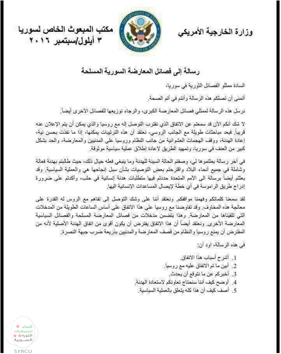 تلقت قادة جيوش وفصائل الجيش الحر من "مايكل راتني" المبعوث الأممي إلى سوريا , تفصيلاُ عن مسودة شروط الهدنة المجرى اتفاقها ما بين روسيا وأميركا .