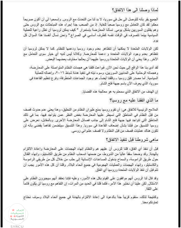 كما طالبت مسودة الهدنة بتعهد فصائل الجيش الحر بعدم اقتراب "جبهة فتح الشام " من المناطق المنزوعة السلاح وعدم دخول المناطق التي تنسحب منها قوات الأسد والقوات الموالية له ..