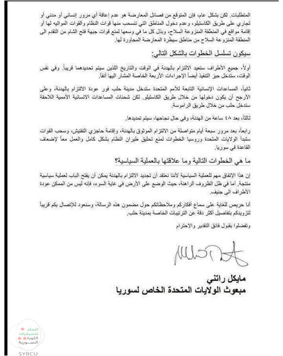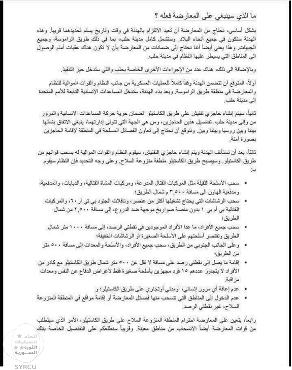 حيث احتوت المسودة عن اعتراف رسمي من قبل العدوان الروسي باستهدافه العشوائي للمدنيين في سائر المدن السورية بحجة ضرب الإرهاب كما يزعم , و أشار  "راتني" على جعل طريق " الكاستيلو " منطقة منزوعة السلاح يطالب فيها قوات الجيش الحر بالإلتزام بعدة شروط مقابل لجم قوات الأسد عن محاربة الجيش الحر وقتل المدنيين .