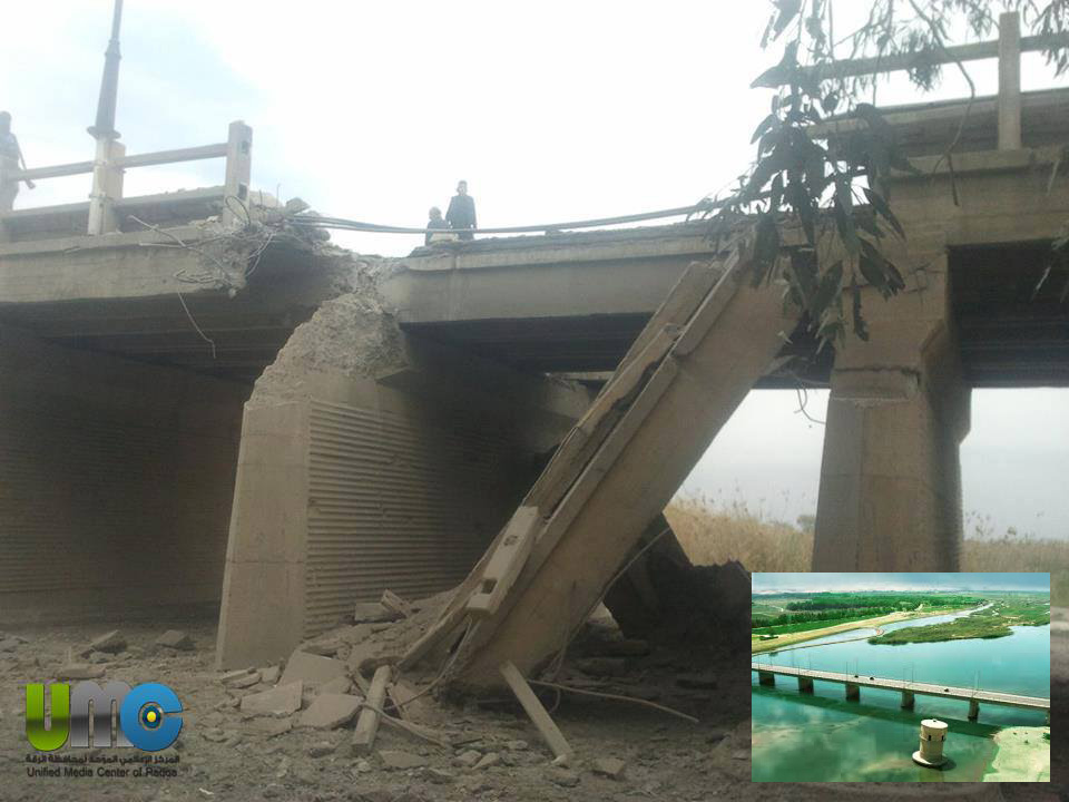 و أفاد مراسل اتحاد تنسيقيات الثورة السورية في الرقة أن المقصود من القصف هو خط المياه الرئيسي الممتد فوق الجسر و الذي يغذي محافظة الرقة أكملها بالمياه .