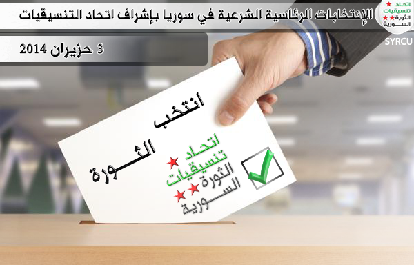 إذ يشرف اتحاد تنسيقيات الثورة على تنظيم الانتخابات في ربوع سوريا المحررة و مناطق لجوء الشعب السوري المطارد من إرهاب عصابة آل الأسد . يحق لكل سوري حر لا يطاله إرهاب أجهزة القمع الإدلاء بصوته في مراكز الانتخاب الشرعية التي يفتتحها النشطاء في محافظات سوريا .