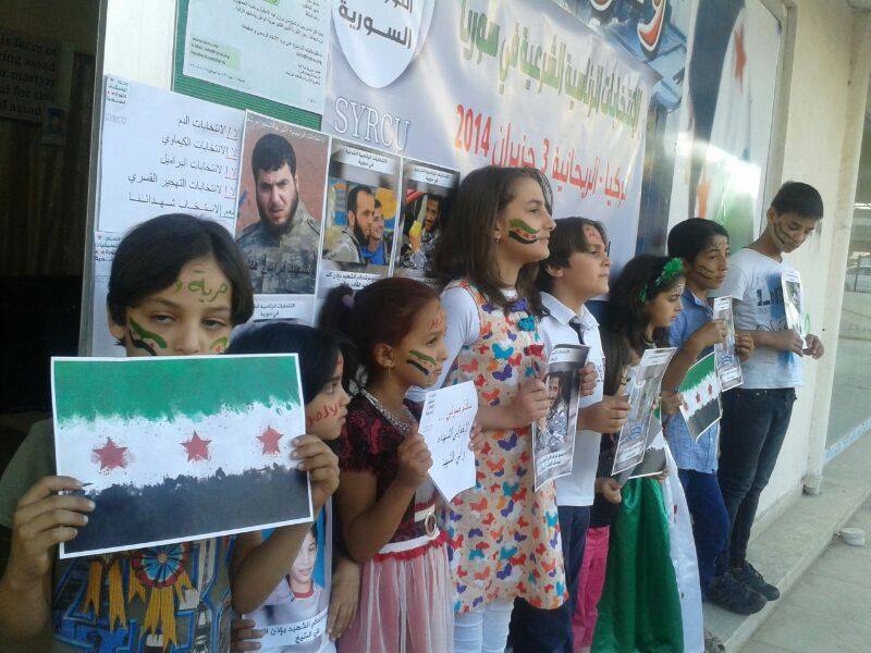 Syrian people who are displaced by Bashar Al-Assad barrels in Northern Syria voting in the polling station whose candidates are the revolution martyrs confirming that they reject Bashar Al-Assad elections and proceed on the path of martyrs until liberation of Syria and trail the dictator Bashar al-Assad .